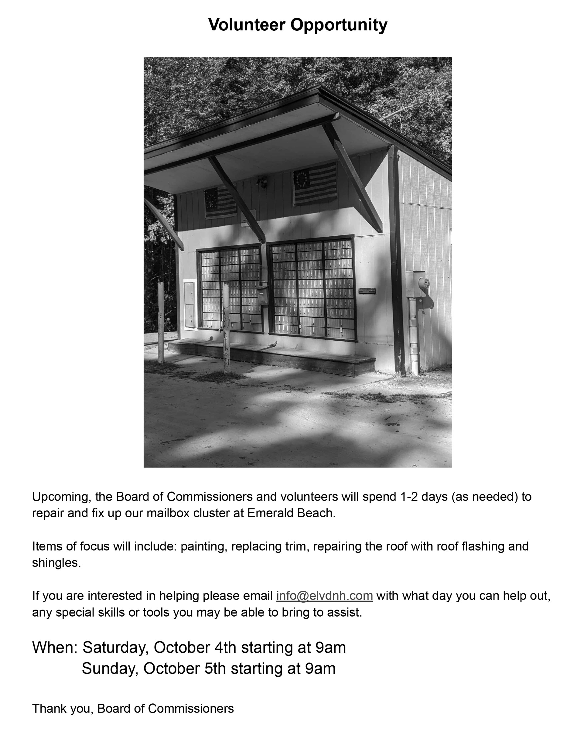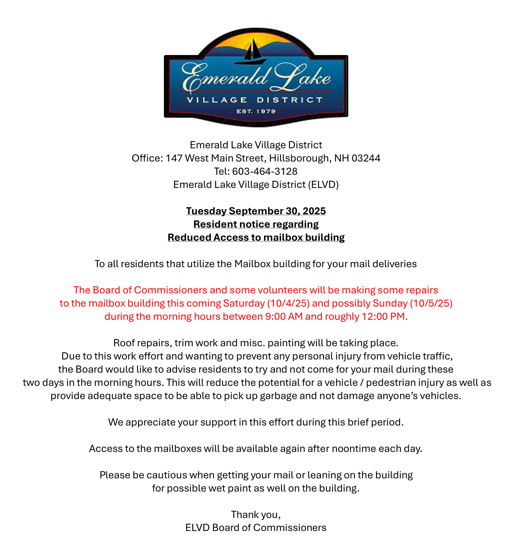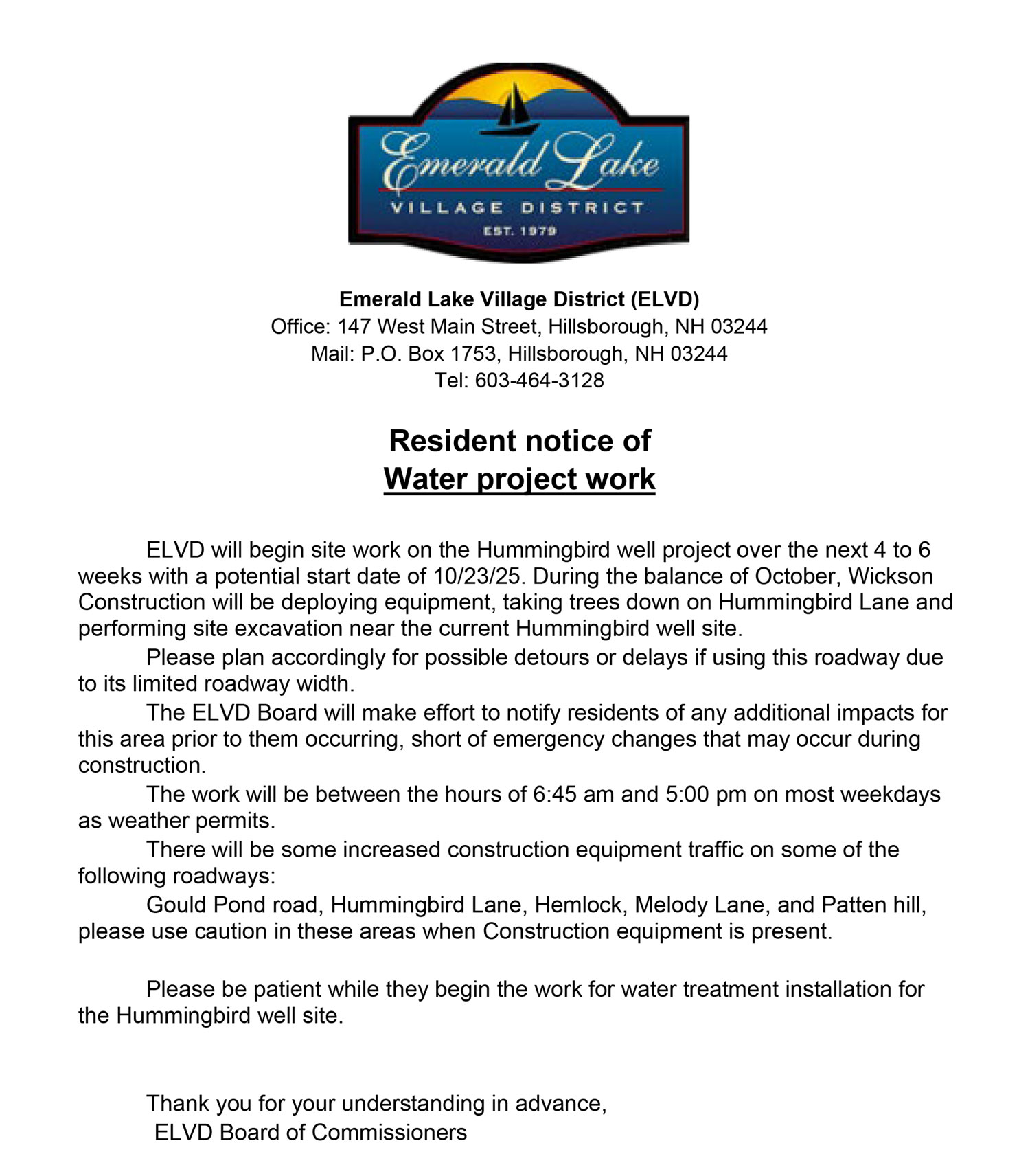 If you have any questions or concerns, please reach out to the Commissioners at info@elvdnh.com. Do NOT approach the contractors.