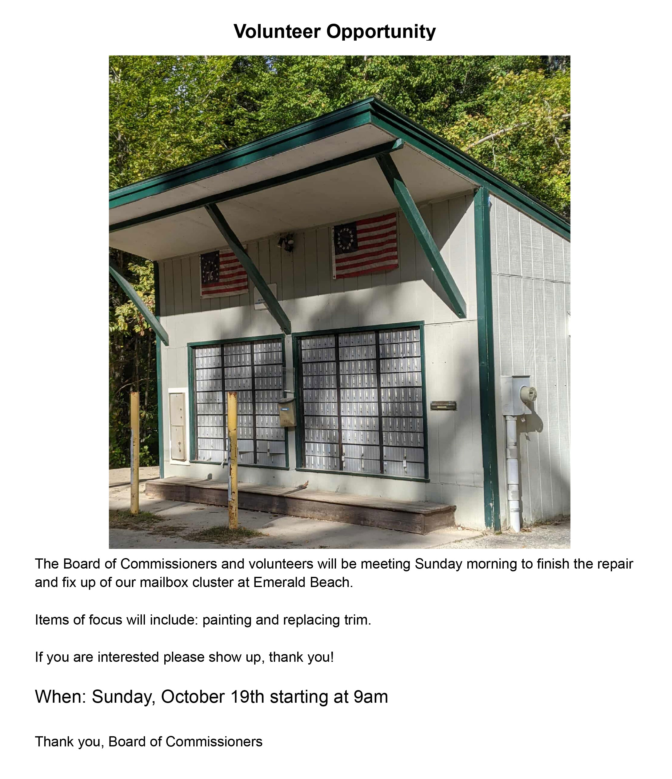 Dear Residents, Our road contractor will be doing pot hole repair throughout the district this week. If you are parked in the roadway, you will be towed, at your expense.