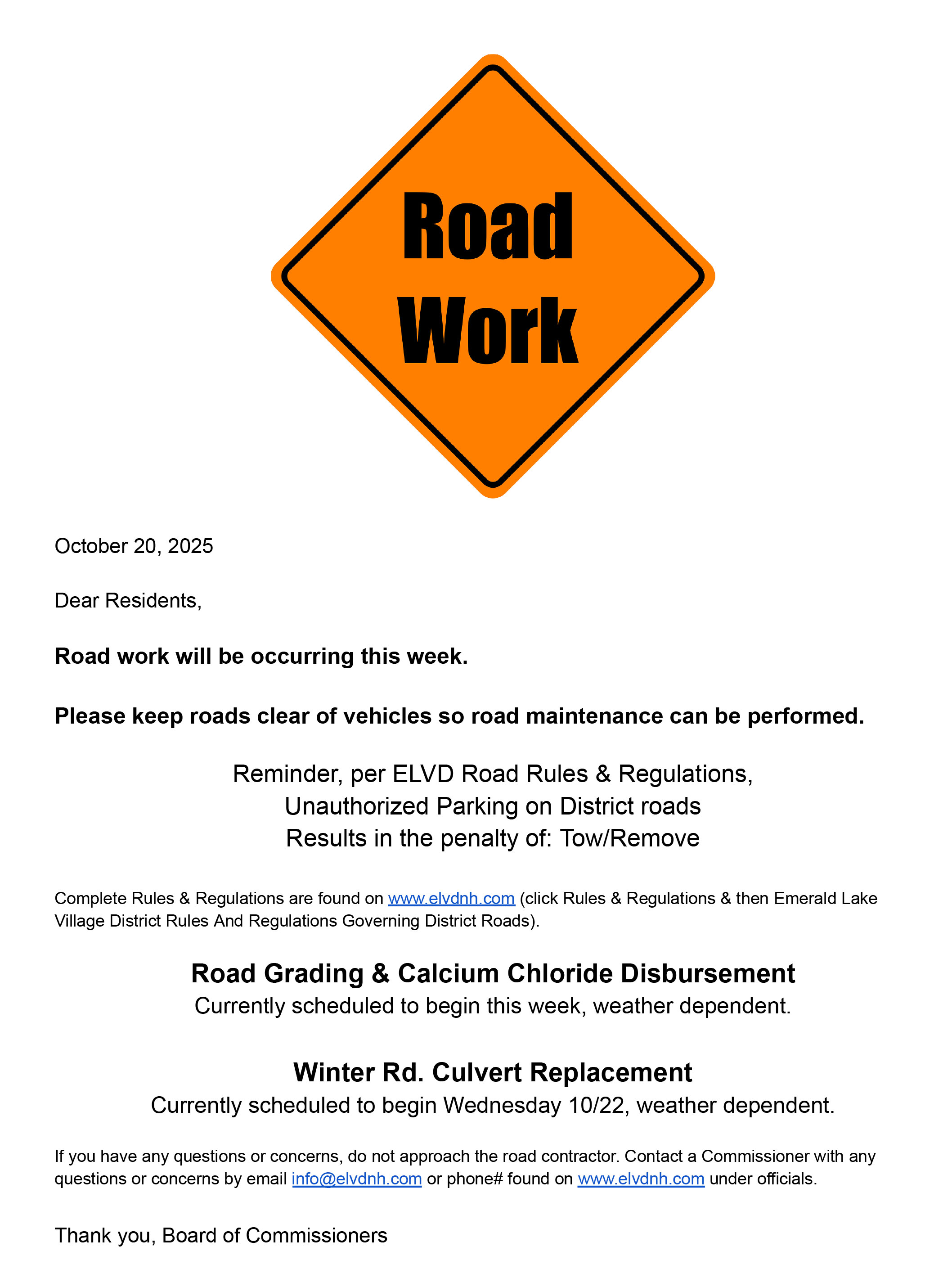 Dear Residents, Our road contractor will be doing pot hole repair throughout the district this week. If you are parked in the roadway, you will be towed, at your expense.